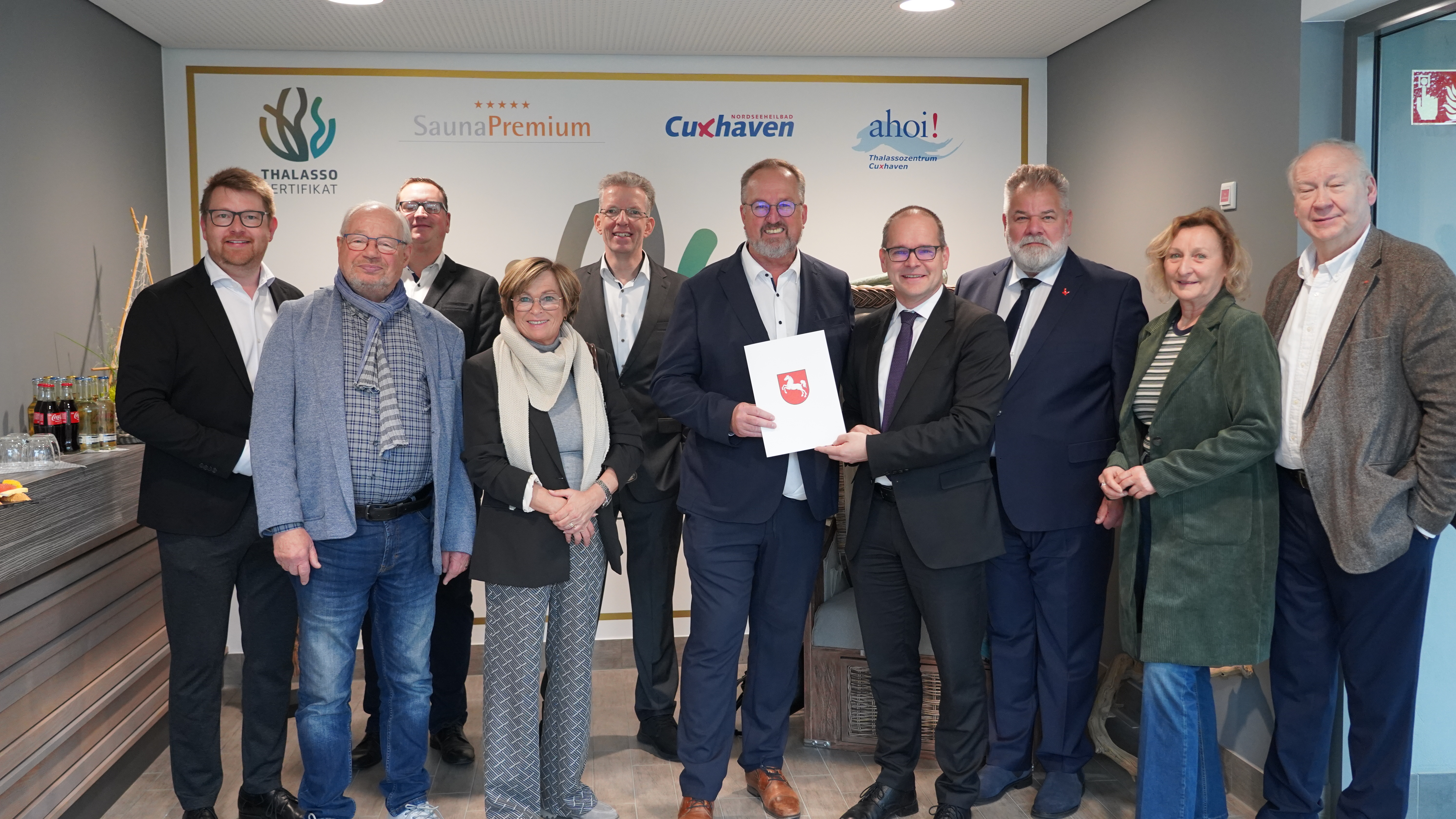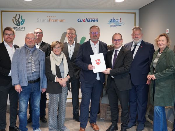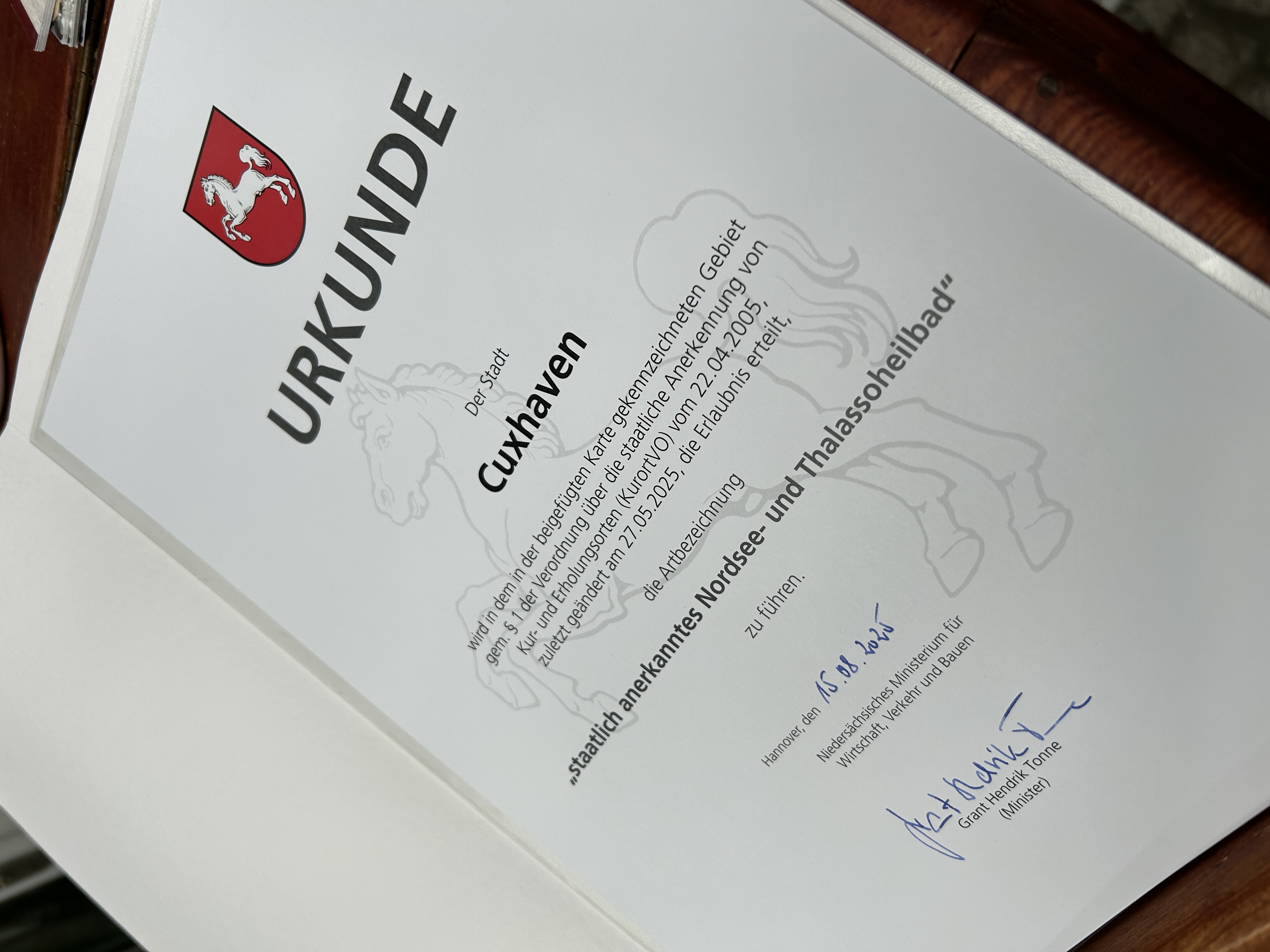 Niedersachsens Wirtschaftsminister Grant Hendrik Tonne überreichte am Samstag im Thalassozentrum ahoi! in Duhnen offiziell die Urkunde an Oberbürgermeister Uwe Santjer, Kurdirektor Olaf Raffel und Badleiter Sascha Bange und damit die Höherprädikatisierung zum „Nordsee- und Thalassoheilbad Cuxhaven“. Kurdirektor und Geschäftsführer der Nordseeheilbad Cuxhaven GmbH Olaf Raffel freut sich über die Auszeichnung: „Die Verleihung markiert nicht nur einen neuen Qualitätsstandard im Gesundheitstourismus und für die Cuxhavener Bürger, sondern unterstreicht auch die Vorreiterrolle Niedersachsens bei der Förderung thalassospezifischer Heilkompetenz. Für Cuxhaven ist diese Auszeichnung ein starkes Signal: Sie bestätigt, dass wir seit Jahren konsequent in Qualität, Nachhaltigkeit und medizinische Kompetenz investieren und dass unser Engagement für gesundheitsbewussten Urlaub an der Nordsee weit über die Region hinausstrahlt.“