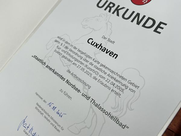 Mit der neuen Prädikatisierung würdigt das Land Niedersachsen die herausragende Gesundheitskompetenz und die kontinuierliche Entwicklung Cuxhavens als Destination im Bereich Thalasso, Prävention und Kurwesen.